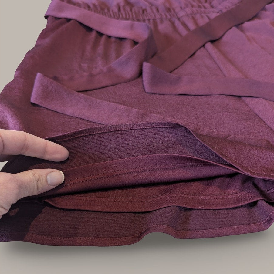 Sleek, soft, and easy to wear, this burgundy romper from Express features a flattering wrap-front design with a self-tie waist and a secure back neck clasp. The shorts are fully lined for comfort, and the smooth 100% polyester fabric has a subtle texture and drape that gives it a touch of polish. Perfect for date nights, brunches, or layering with a blazer for an elevated casual look.